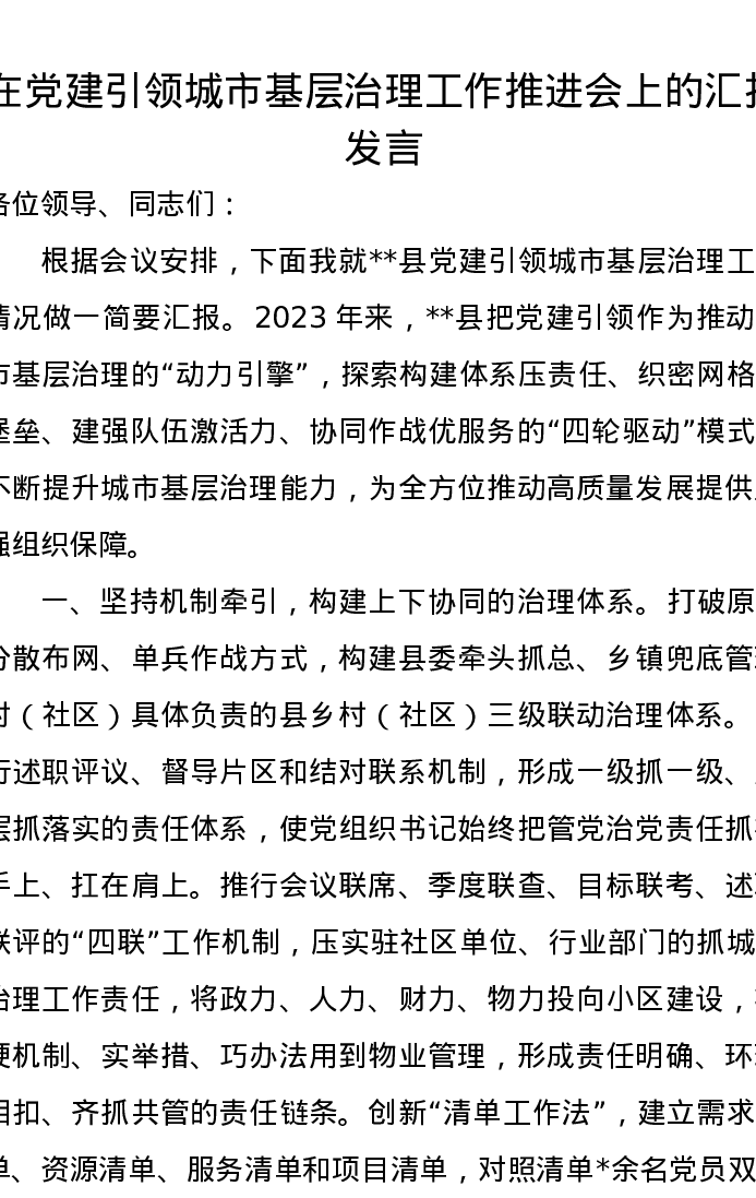 在党建引领城市基层治理工作推进会上的汇报发言