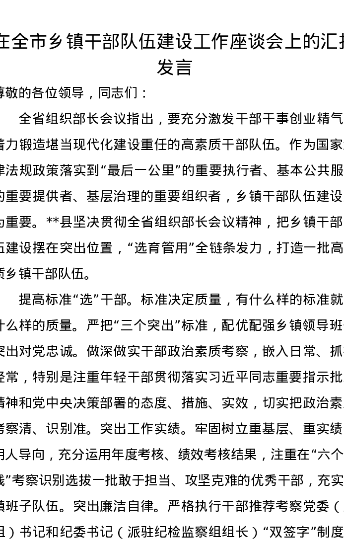 在全市乡镇干部队伍建设工作座谈会上的汇报发言