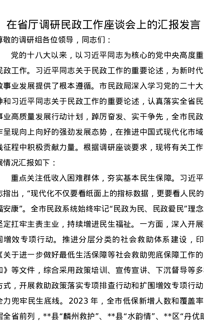 在省厅调研民政工作座谈会上的汇报发言