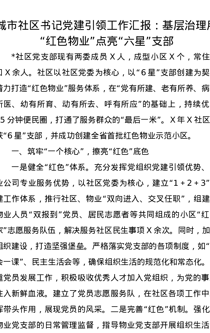 城市社区书记党建引领工作汇报:基层治理用“红色物业”点亮“六星”支部