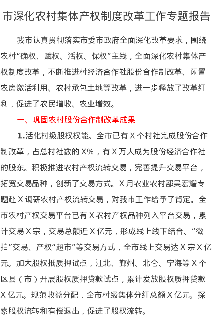 市深化农村集体产权制度改革工作专题报告