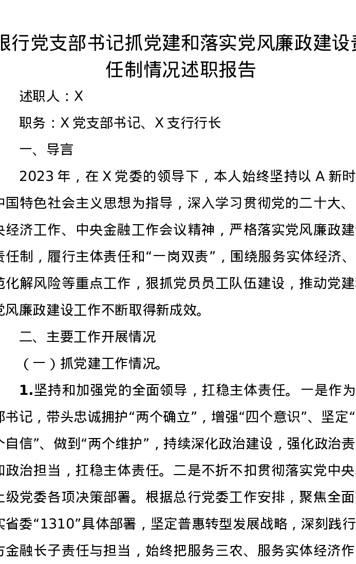 银行党支部书记抓党建和落实党风廉政建设责任制情况述职报告
