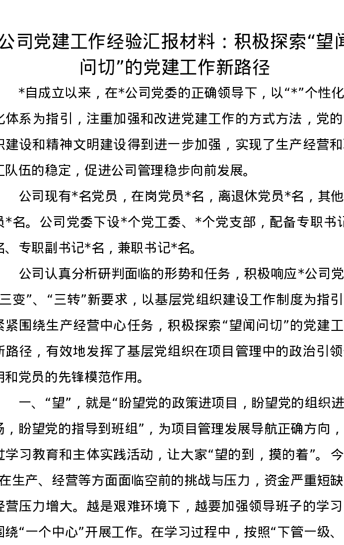 公司党建工作经验汇报材料:积极探索“望闻问切”的党建工作新路径