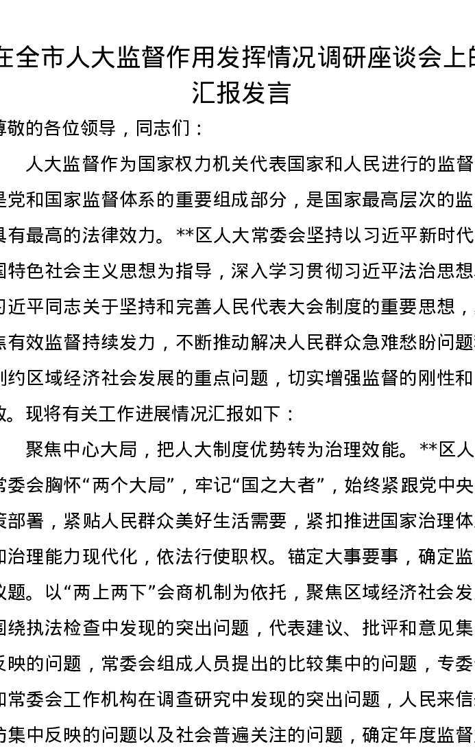 在全市人大监督作用发挥情况调研座谈会上的汇报发言