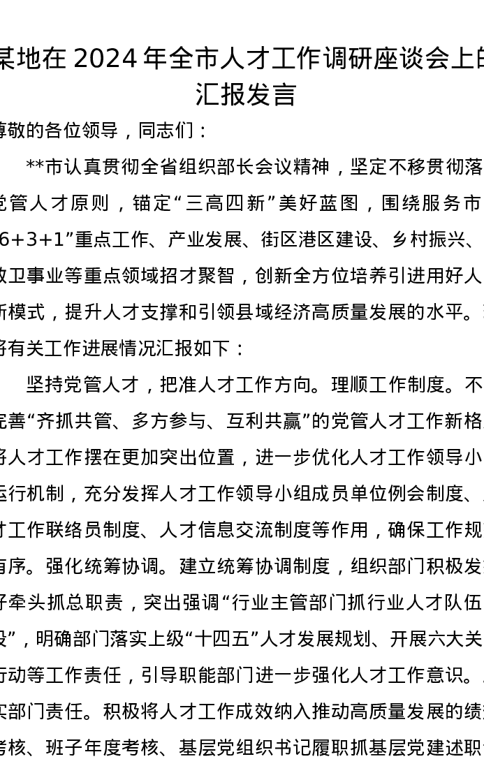 某地在2024年全市人才工作调研座谈会上的汇报发言