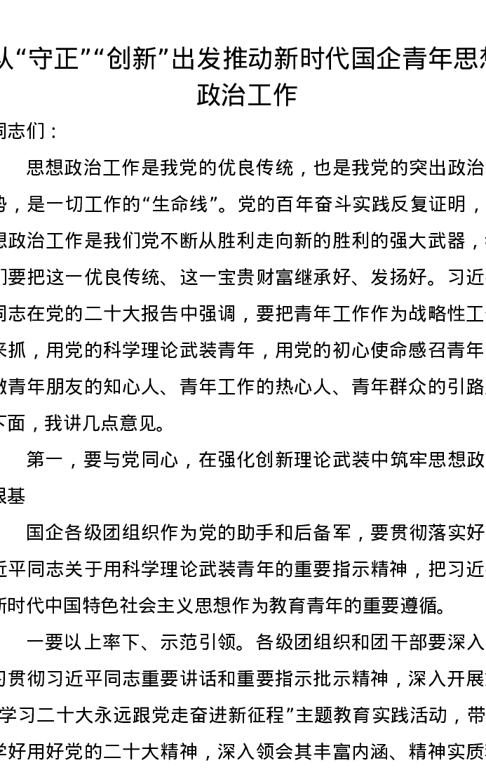党课讲稿:从“守正”“创新”出发推动新时代国企青年思想政治工作