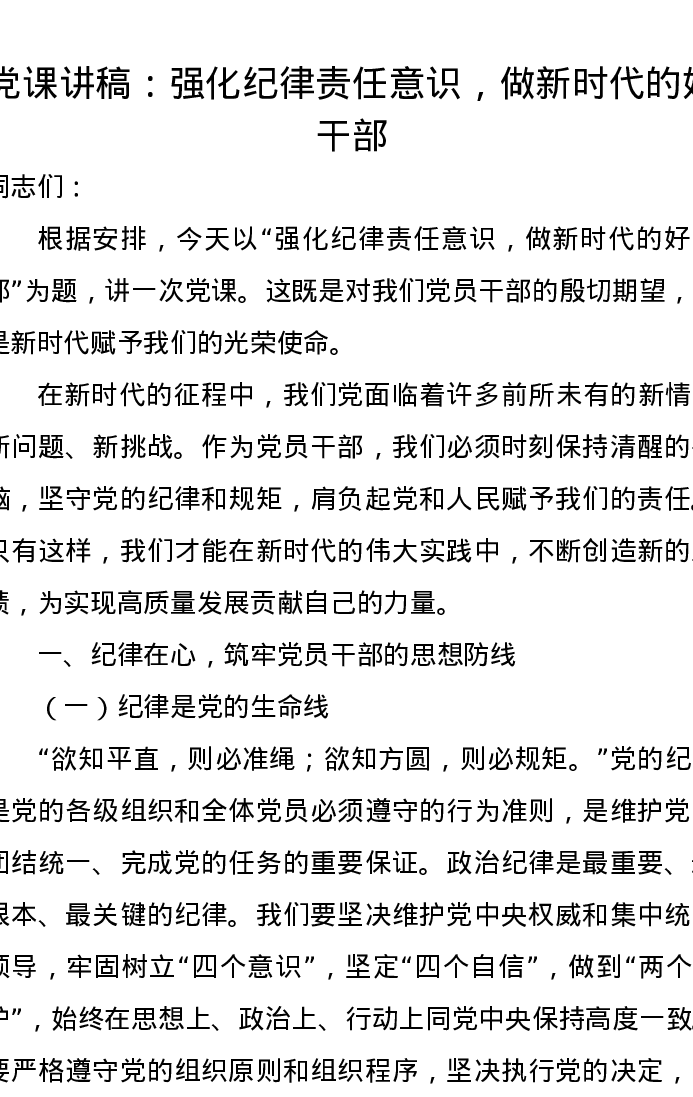 党课讲稿:强化纪律责任意识,做新时代的好干部
