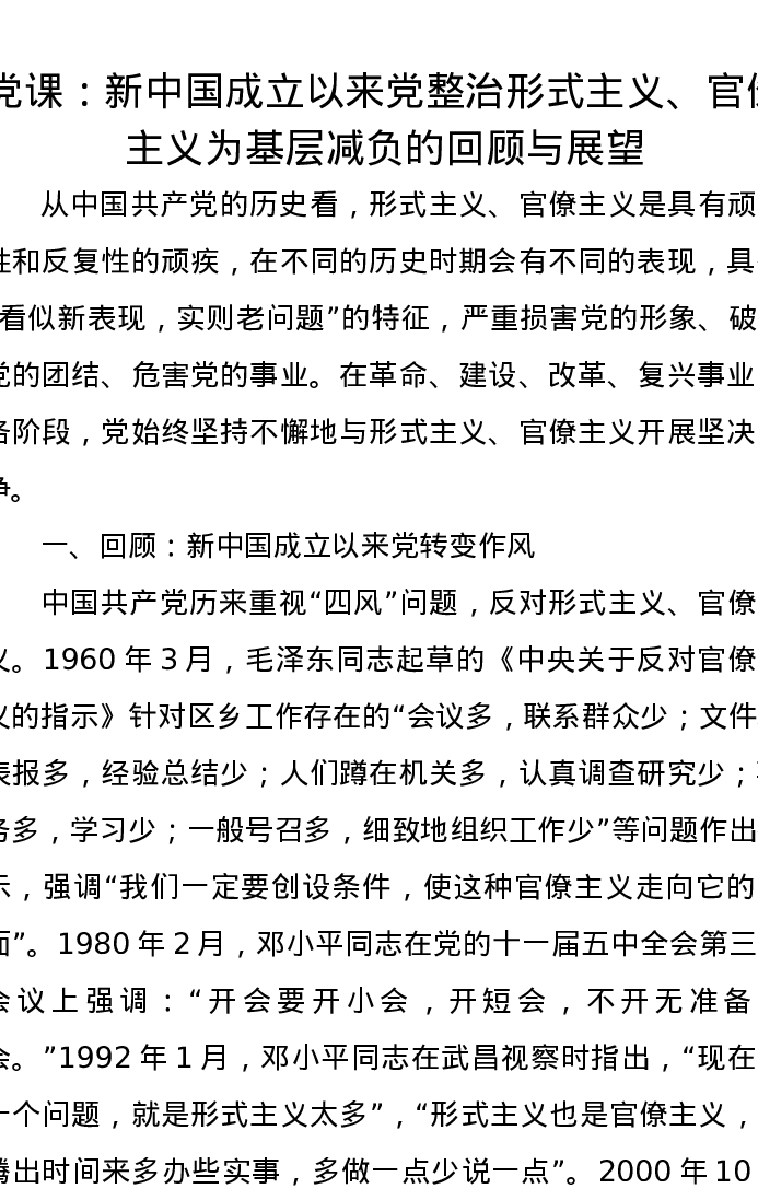 党课讲稿:新中国成立以来党整治形式主义、官僚主义为基层减负的回顾与展望