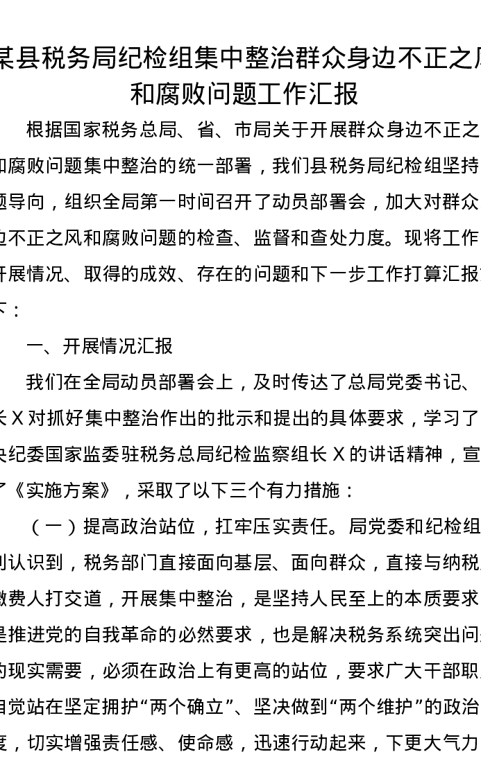 某县税务局纪检组集中整治群众身边不正之风和腐败问题工作汇报