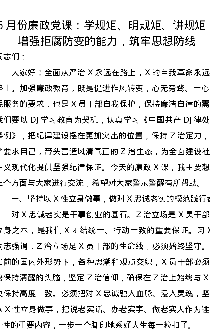 6月份廉政党课:学规矩、明规矩、讲规矩,增强拒腐防变的能力,筑牢思想防线
