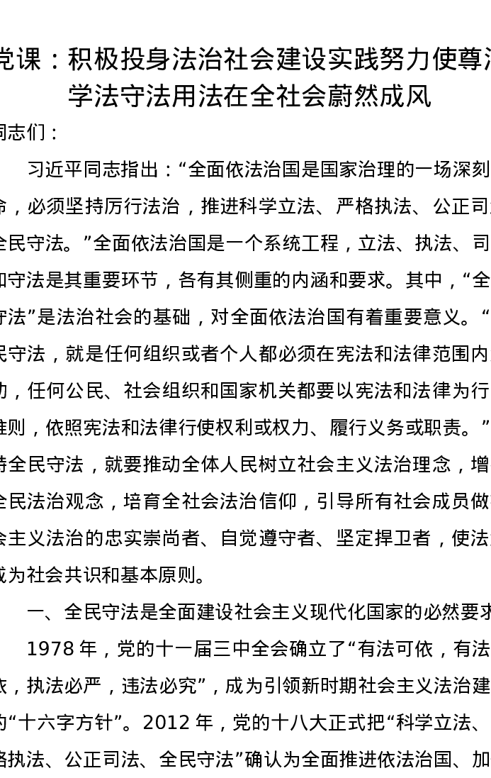 党课:积极投身法治社会建设实践努力使尊法学法守法用法在全社会蔚然成风