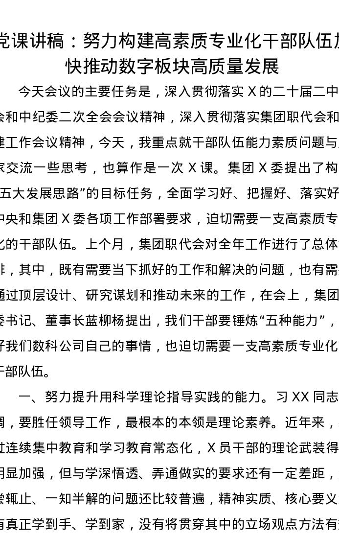 党课讲稿:努力构建高素质专业化干部队伍加快推动数字板块高质量发展