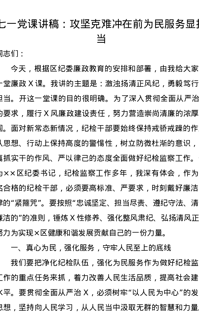 七一党课讲稿:攻坚克难冲在前为民服务显担当