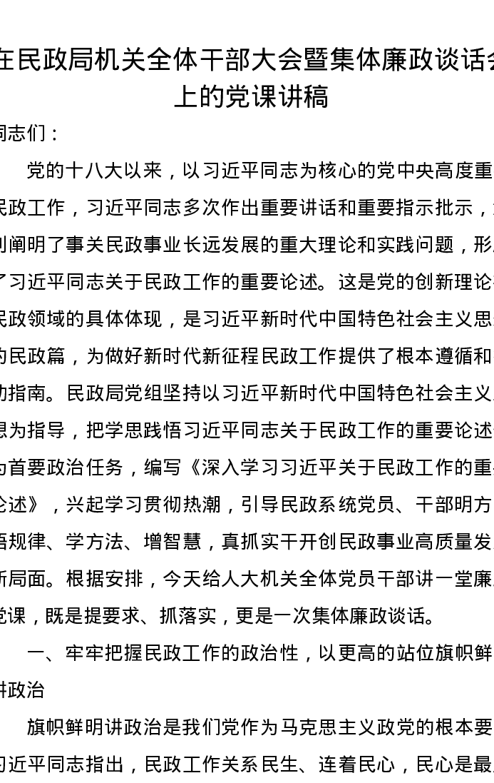 在民政局机关全体干部大会暨集体廉政谈话会上的党课讲稿