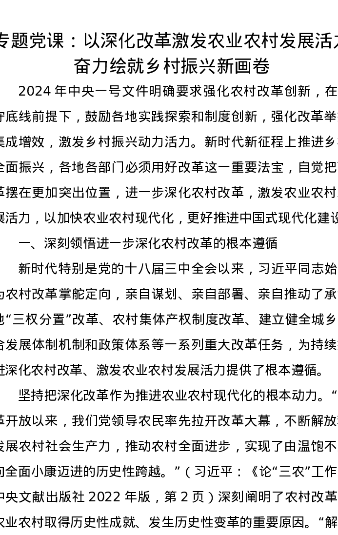 专题党课讲稿:以深化改革激发农业农村发展活力,奋力绘就乡村振兴新画卷