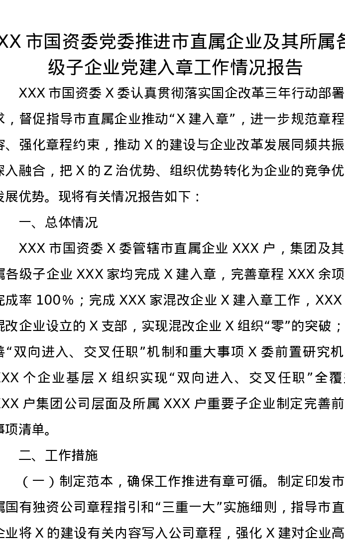 XX市国资委党委推进市直属企业及其所属各级子企业党建入章工作情况报告