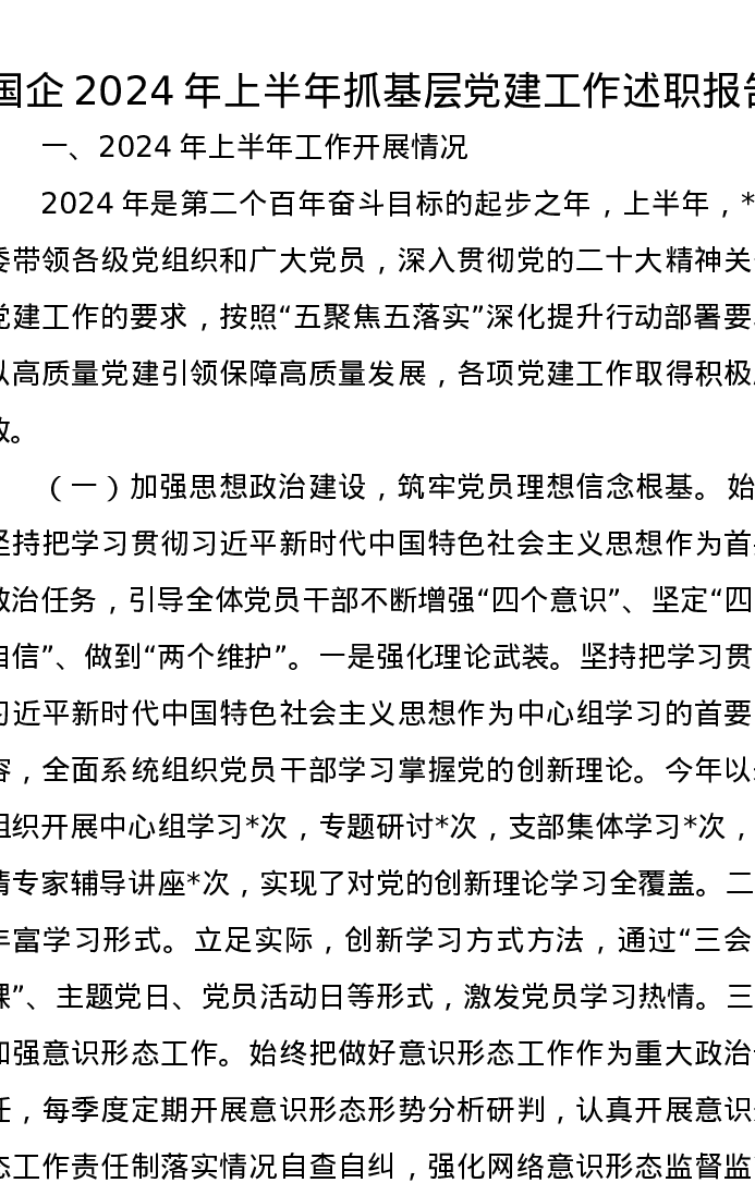 国企2024年上半年抓基层党建工作述职报告