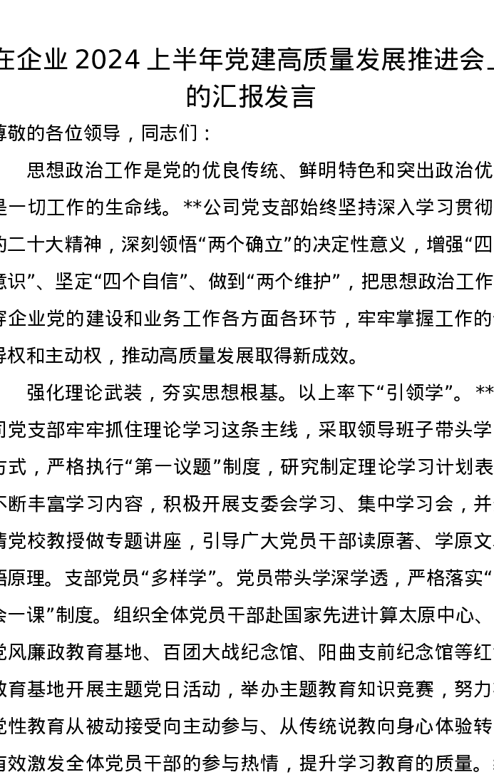 在企业2024上半年党建高质量发展推进会上的汇报发言