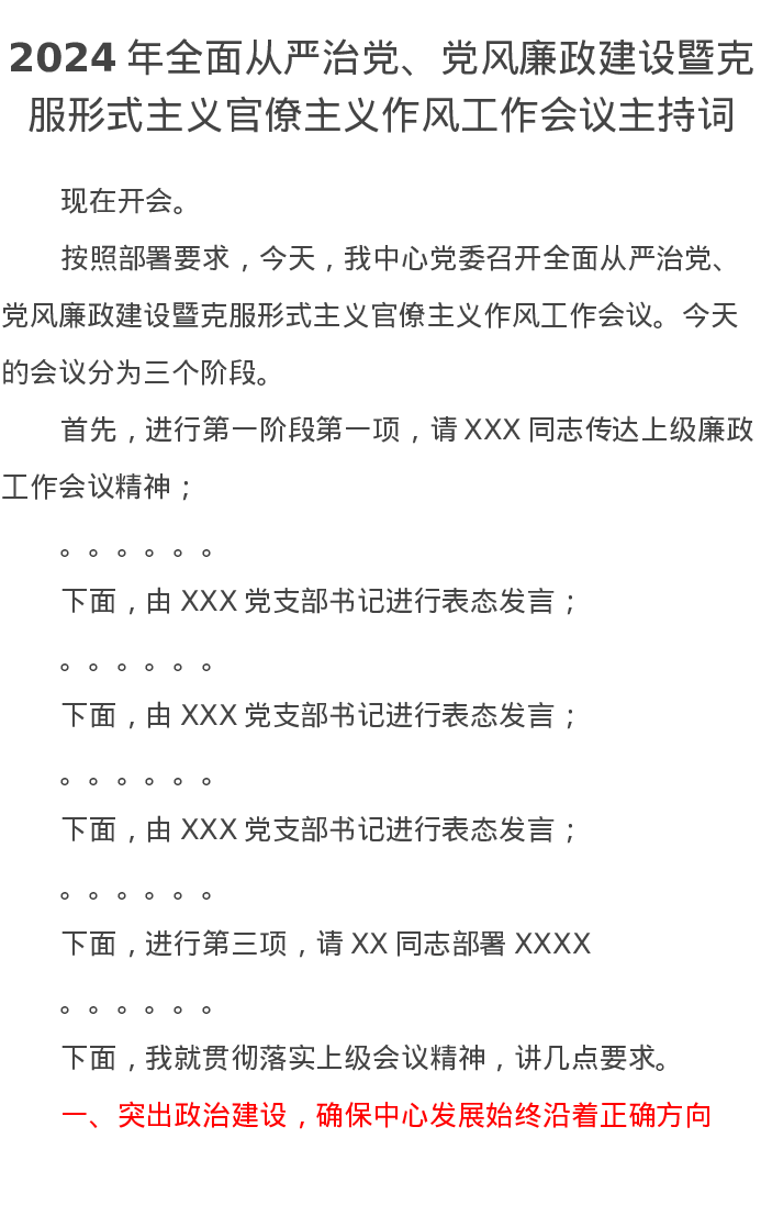 2024年全面从严治党、党风廉政建设暨克服形式主义官僚主义作风工作会议主持词