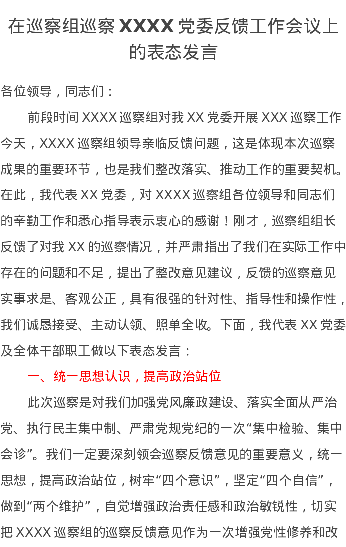 在巡察组巡察XXXX党委反馈工作会议上的表态发言