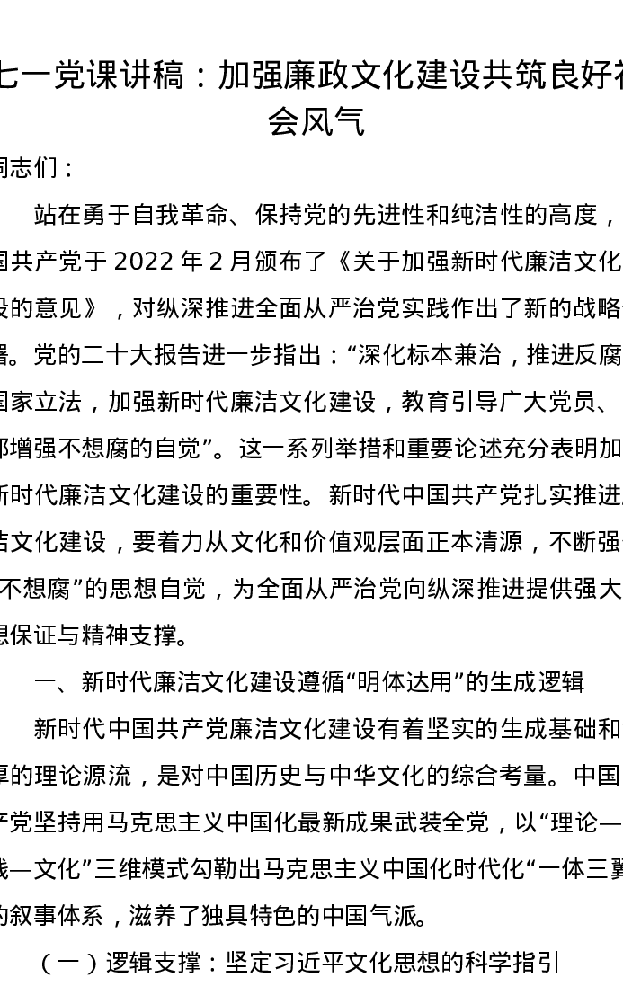 七一党课讲稿:加强廉政文化建设共筑良好社会风气