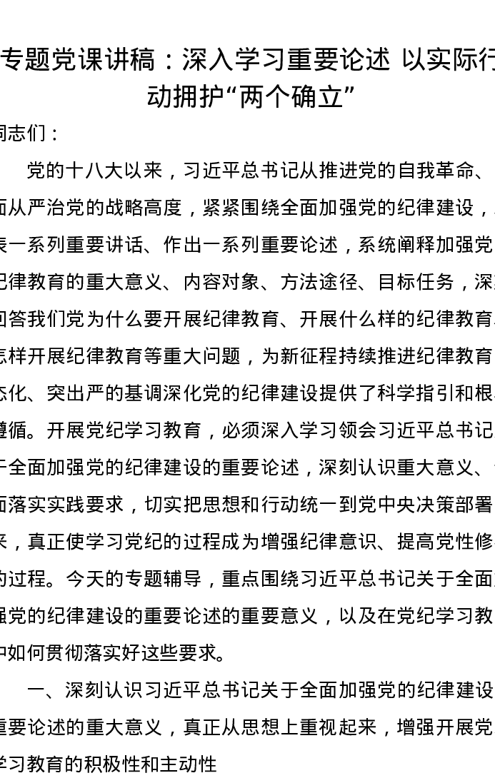 专题党课讲稿:深入学习重要论述,以实际行动拥护“两个确立”