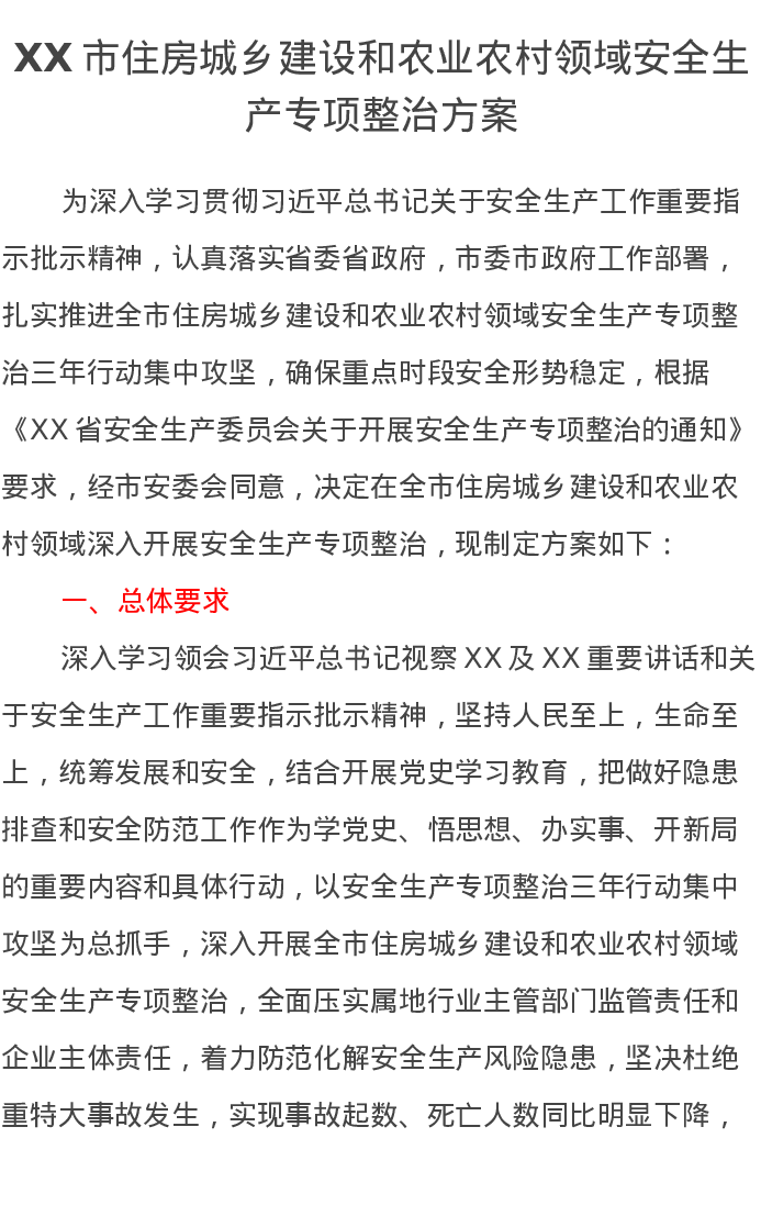 XX市住房城乡建设和农业农村领域安全生产专项整治方案