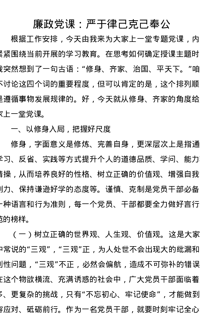 廉政党课:严于律己克己奉公