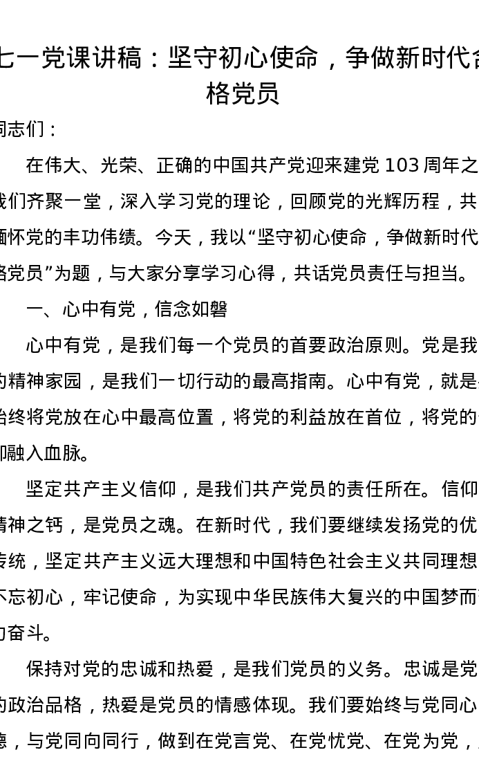 七一党课讲稿:坚守初心使命,争做新时代合格党员