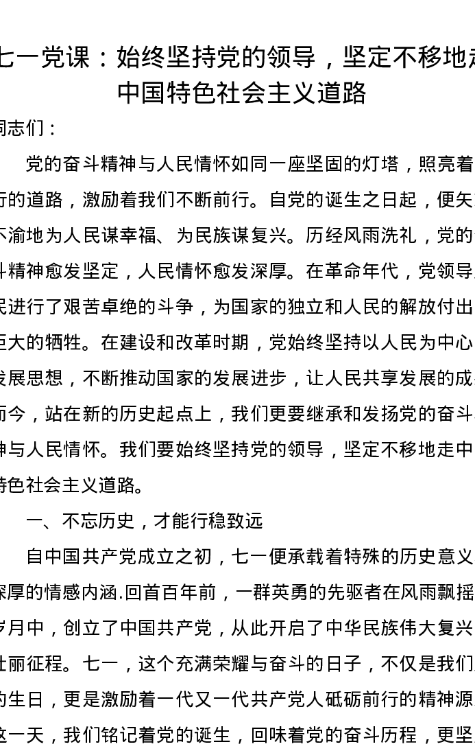 七一党课讲稿:始终坚持党的领导,坚定不移地走中国特色社会主义道路