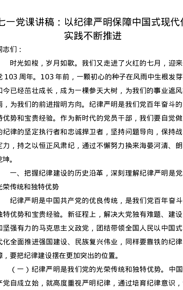 七一党课讲稿:以纪律严明保障中国式现代化实践不断推进