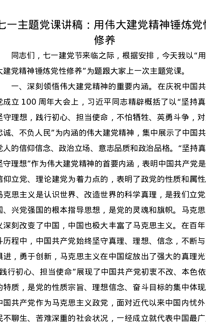 七一主题党课讲稿:用伟大建党精神锤炼党性修养