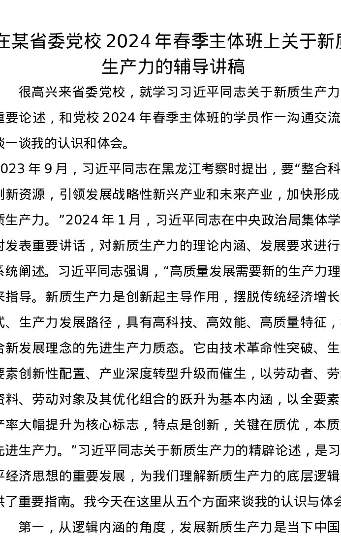 在某省委党校2024年春季主体班上关于新质生产力的辅导讲稿