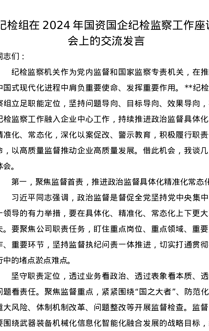 纪检组在2024年国资国企纪检监察工作座谈会上的交流发言