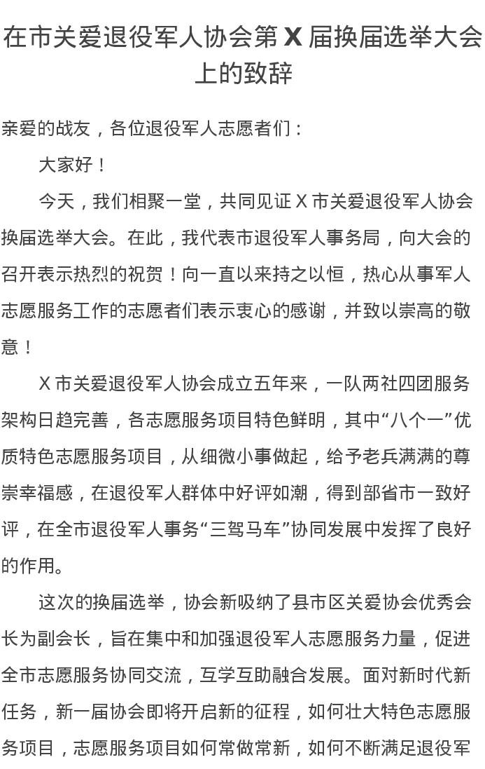 在市关爱退役军人协会第X届换届选举大会上的致辞