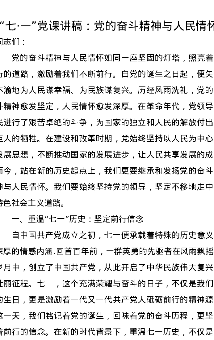 “七·一”党课讲稿:党的奋斗精神与人民情怀