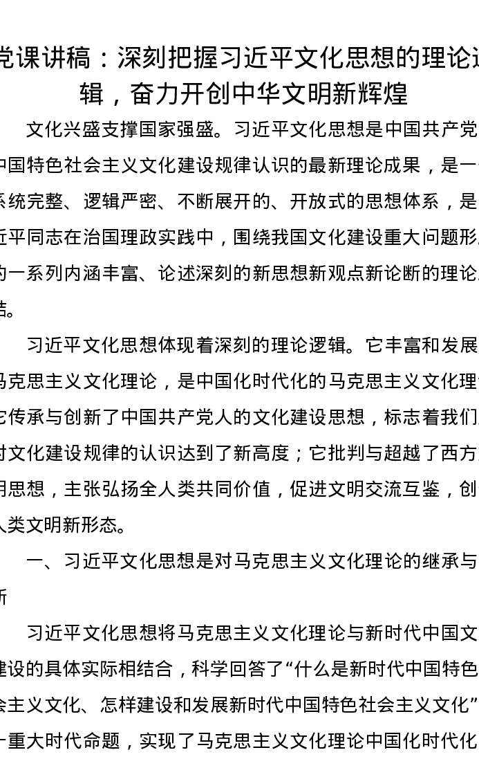 党课讲稿:深刻把握习近平文化思想的理论逻辑,奋力开创中华文明新辉煌
