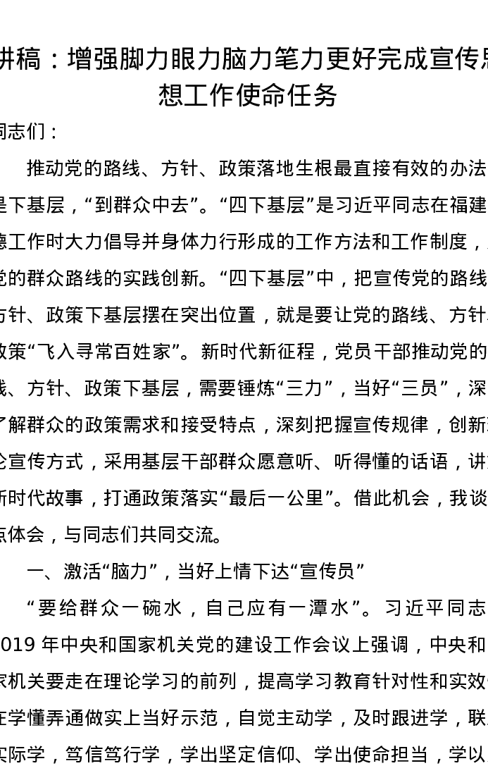 讲稿:增强脚力眼力脑力笔力更好完成宣传思想工作使命任务