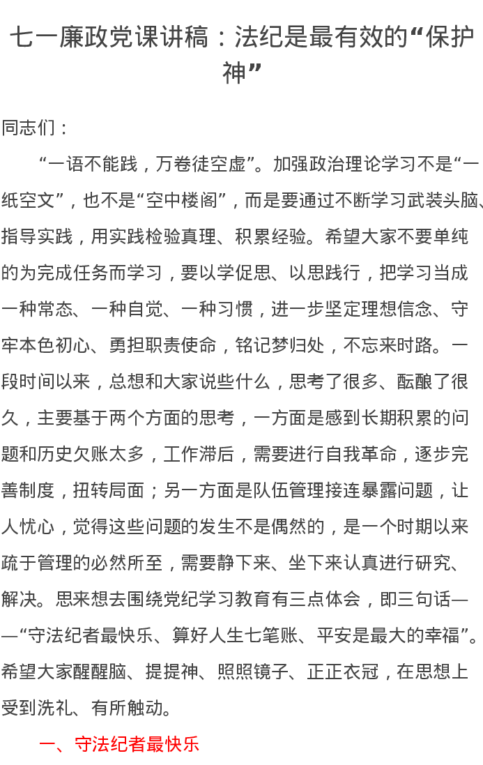 七一廉政党课讲稿:法纪是最有效的“保护神”