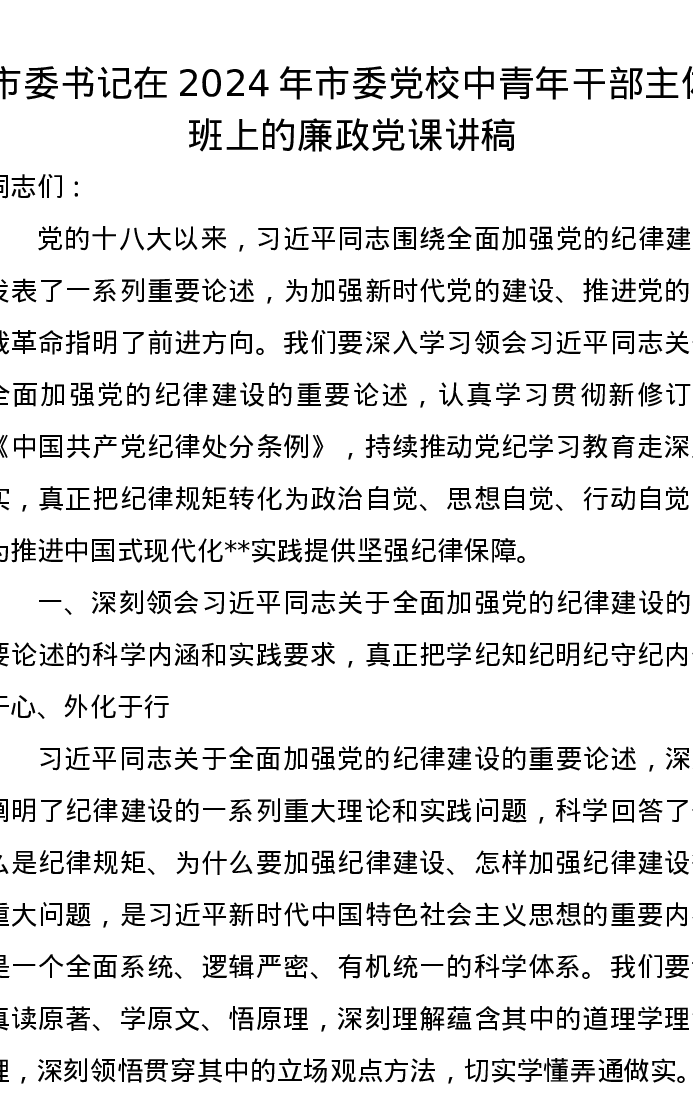 市委书记在2024年市委党校中青年干部主体班上的廉政党课讲稿