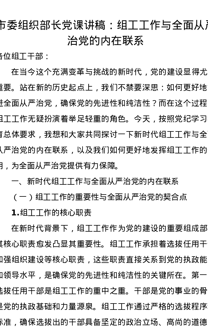 市委组织部长党课讲稿:组工工作与全面从严治党的内在联系