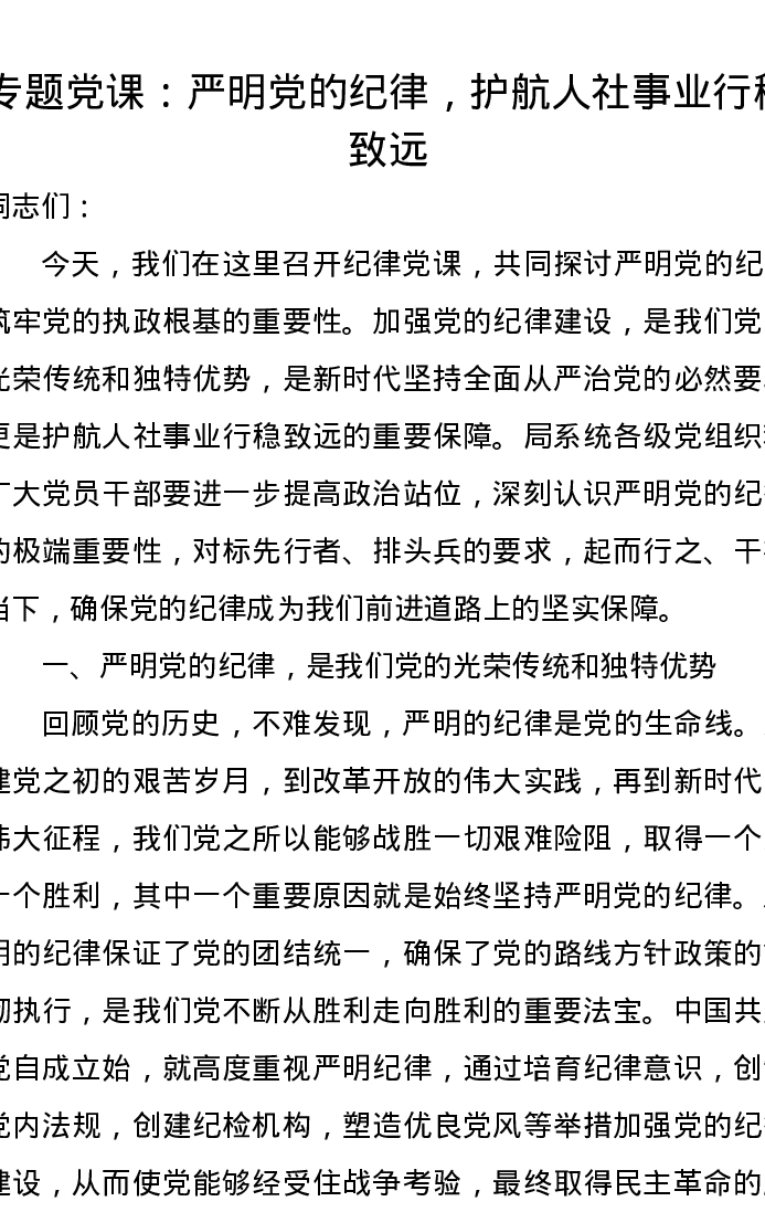 专题党课:严明党的纪律,护航人社事业行稳致远