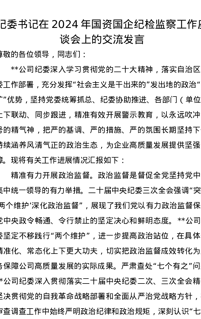 纪委书记在2024年国资国企纪检监察工作座谈会上的交流发言