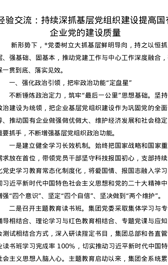 经验交流:持续深抓基层党组织建设提高国有企业党的建设质量