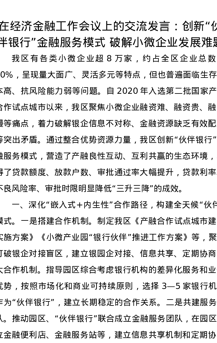 在经济金融工作会议上的交流发言:创新“伙伴银行”金融服务模式,破解小微企业发展难题