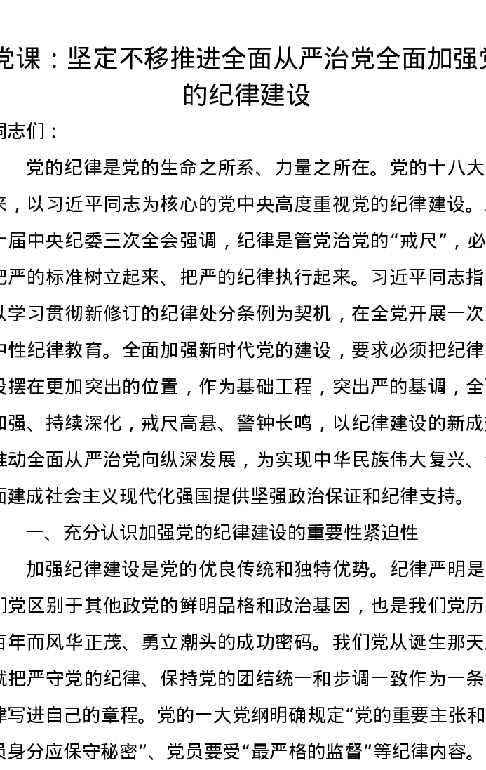 党课:坚定不移推进全面从严治党全面加强党的纪律建设