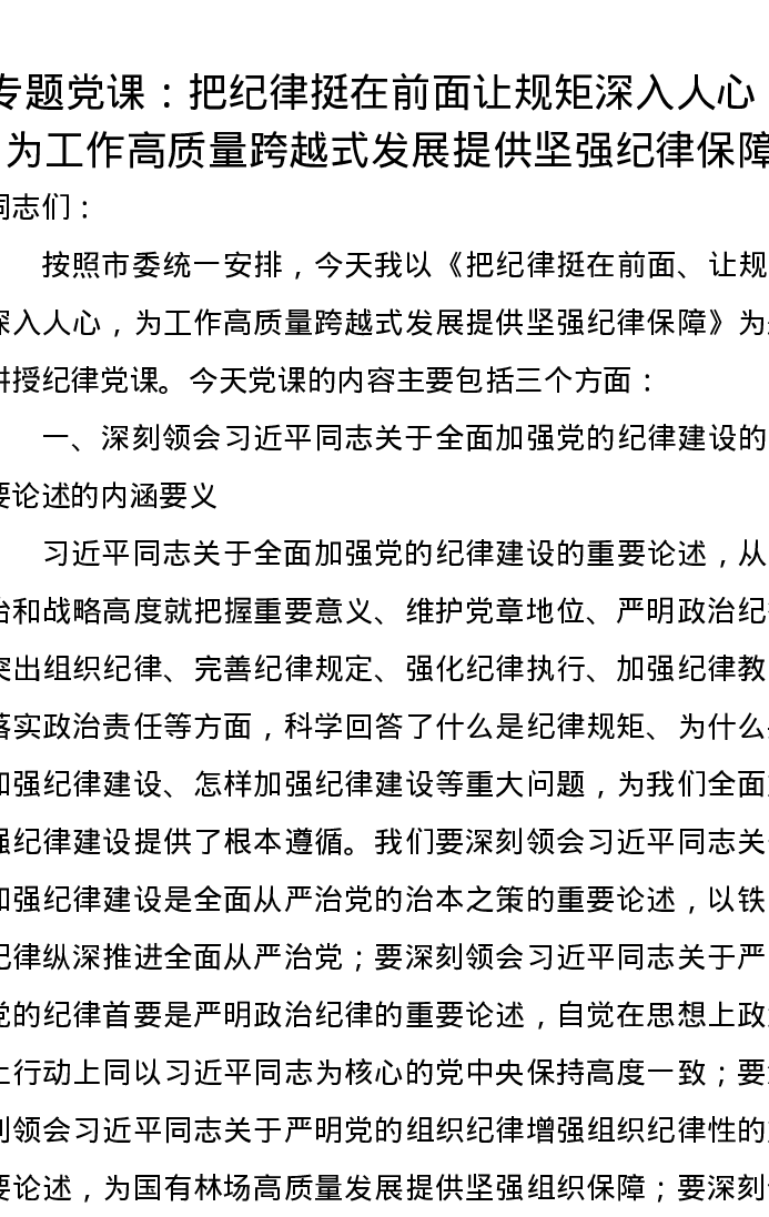 党课讲稿:把纪律挺在前面让规矩深入人心,为工作高质量跨越式发展提供坚强纪律保障