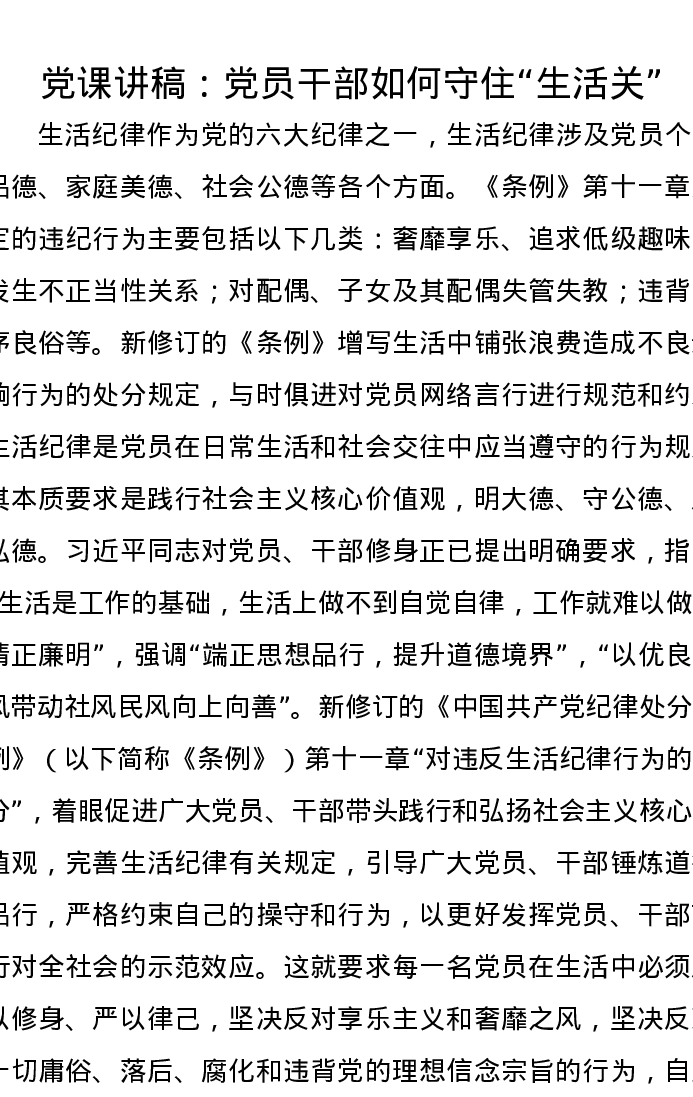党课讲稿:党员干部如何守住“生活关”