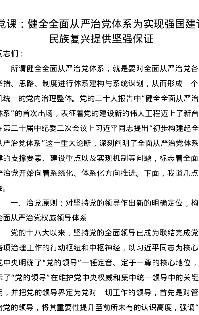党课讲稿:健全全面从严治党体系为实现强国建设、民族复兴提供坚强保证