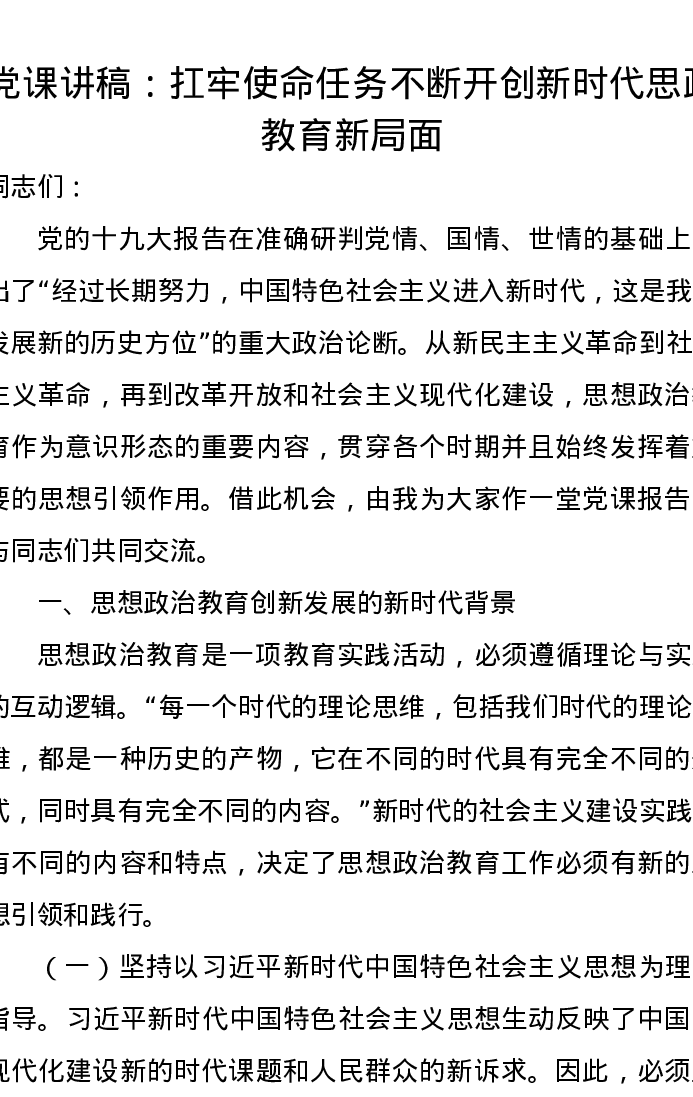 党课讲稿:扛牢使命任务不断开创新时代思政教育新局面